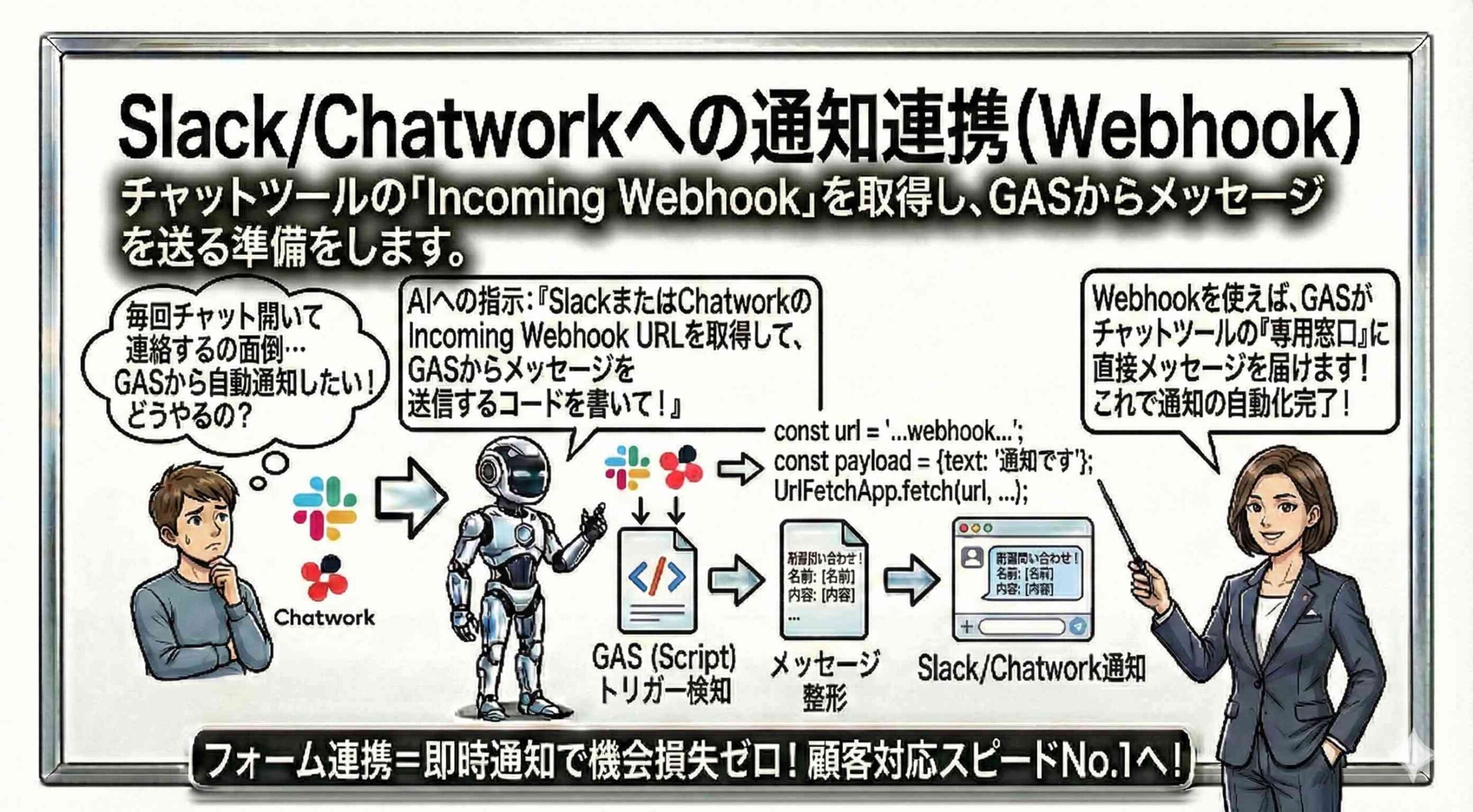 現代のビジネス環境において、電子メールは依然として公式な通信手段としての地位を保っていますが、迅速な意思決定やチーム内のコラボレーションにおいてはSlackやChatworkといったチャットツールが主役の座を占めています。開発者としてシステムを設計する際、Google Apps Script(GAS)で処理されたデータや検知されたイベントを、いかに低遅延かつ確実にユーザーの目に触れる場所に届けるかは、システムの価値を左右する重要な要素です。メールボックスに埋もれてしまう通知は、実質的に存在しないのと同じだからです。本章では、GASとこれらチャットツールを連携させるための核心技術であるWebhookとAPIの基礎を構築します。